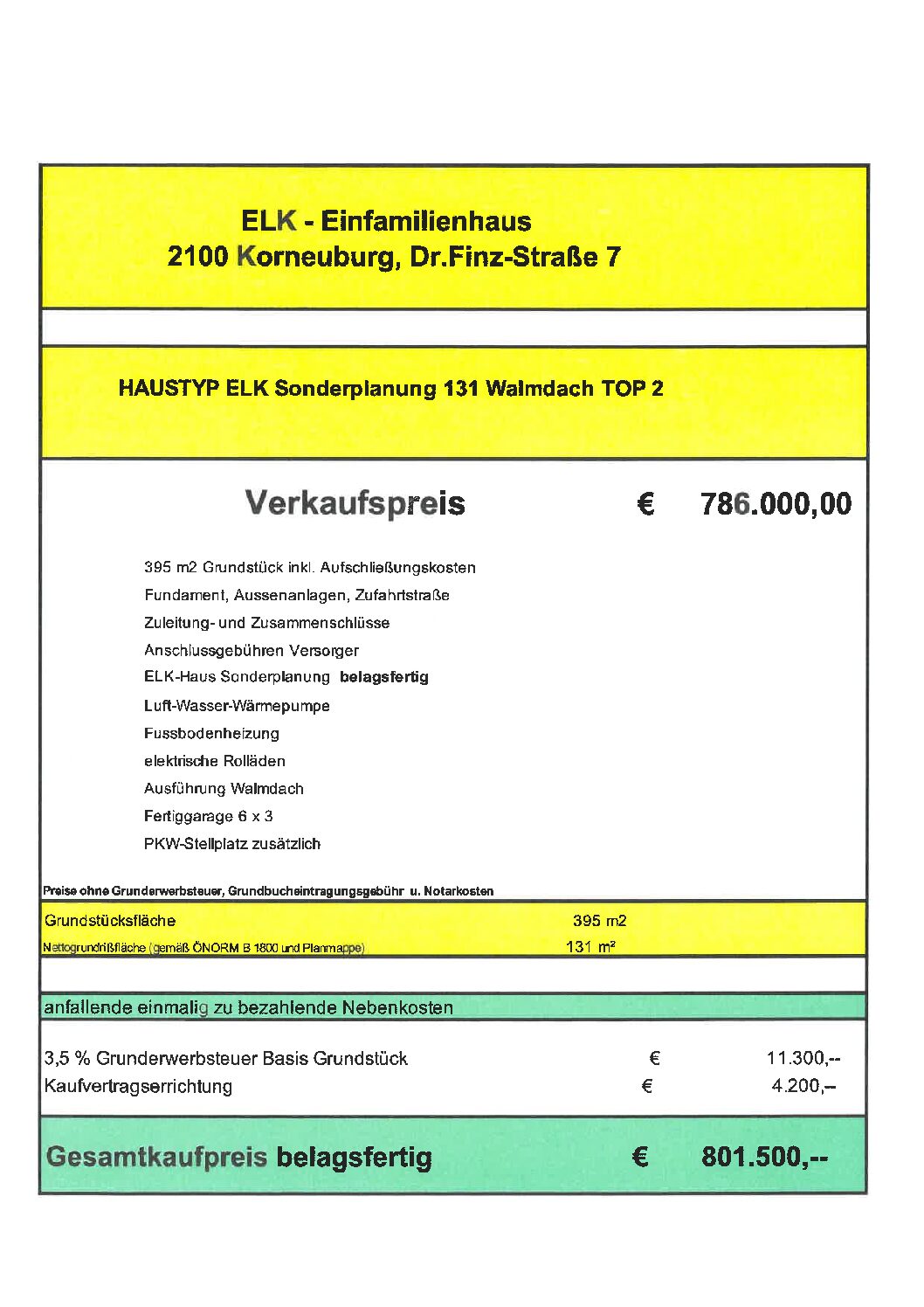 Das Haus wird in belagsfertigem Zustand übergeben und auf einer Bodenplatte errichtet, Keller sowie Schlüsselfertigstellung gegen Aufpreis möglich. Es besteht weiters die Möglichkeit ein größeres Grundstück zu wählen – siehe Preisblatt Top 1.